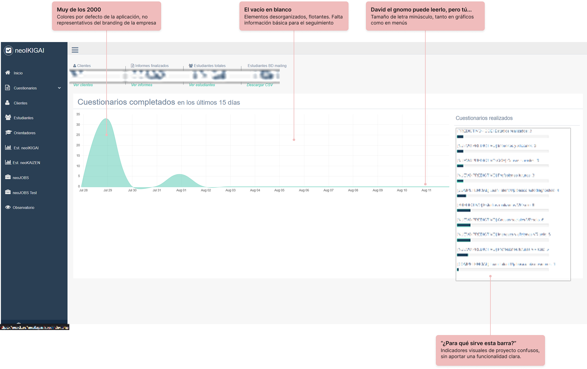Diseño desfasado y poco accesible: tanto los usuarios a nivel interno, como los propios usuarios finales de la herramienta acusan la falta de un aspecto más moderno, así como mejoras de calidad, como la posibilidad de gestionar usuarios de una manera más rápida y sencilla.