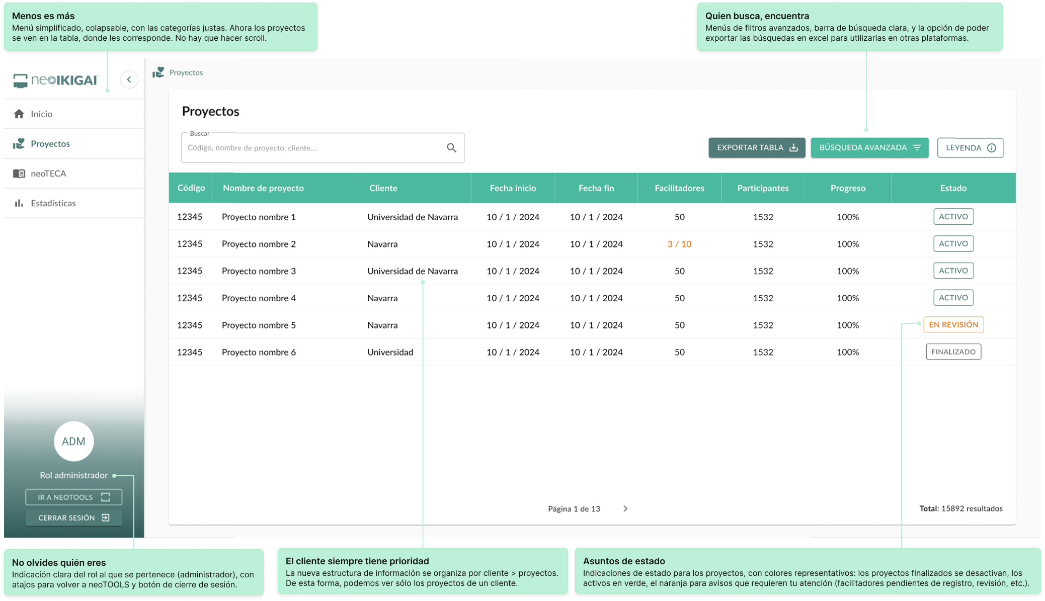 En la pantalla de proyectos la disposición de los elementos en la tabla ha cambiado radicalmente. Antes se generaban proyecto individuales, sin ninguna agrupación (duplicando el cliente y dificultando la búsqueda). Ahora, agrupamos los proyectos por cliente en nuestra aplicación neoTOOLS, los cual nos permite asignar varios proyectos al mismo cliente y realizar búsquedas con más precisión.Además, cambiamos el aspecto visual y estructuramos una mejor diferenciación entre código de proyecto, nº de participantes y el estado del proyecto. Todos los menús de modificación se encuentran al ver el detalle del proyecto, ya que la eliminación de proyectos se realiza desde la plataforma de gestión. Permitimos además, descargar una tabla con la correlación de todos los proyectos en caso de que se quiera utilizar de forma externa.