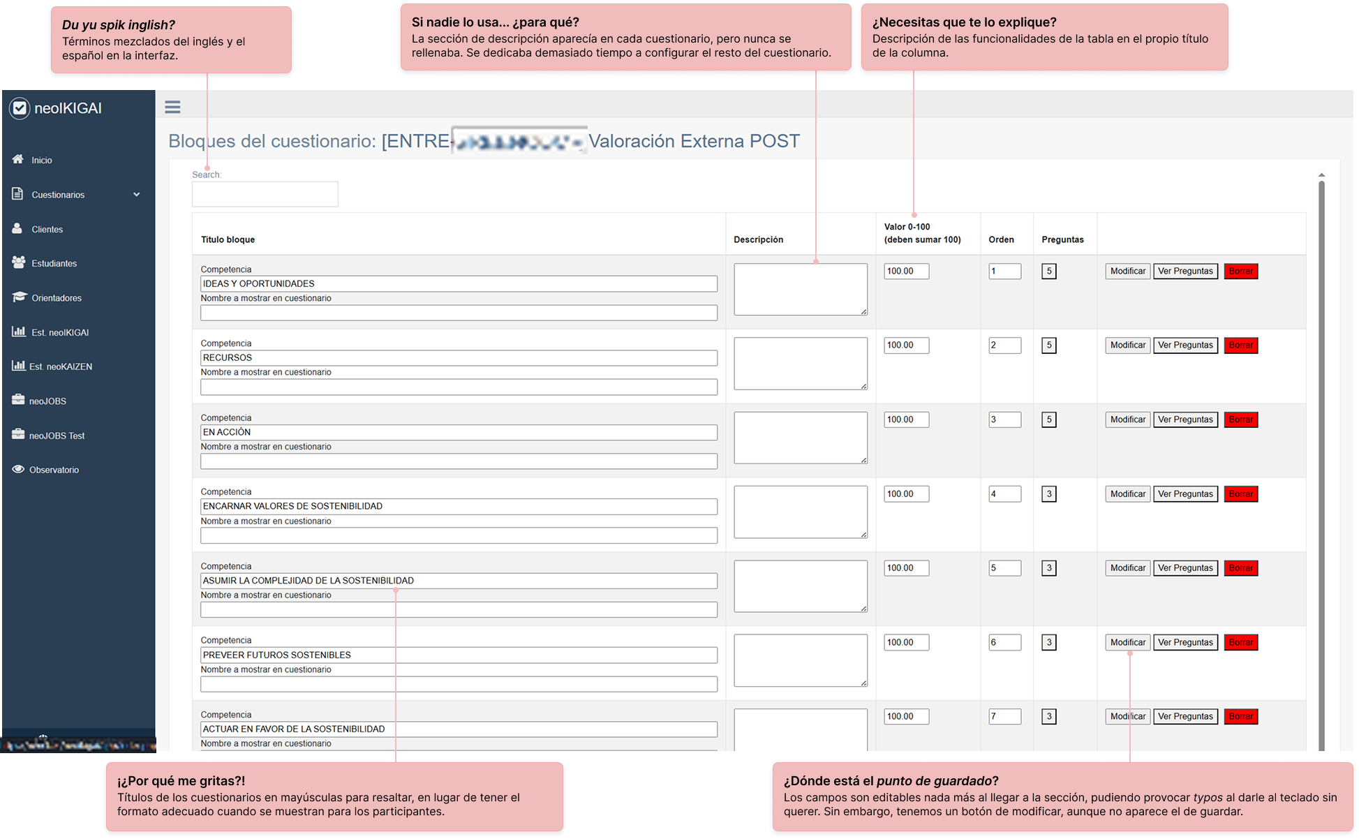 Deuda técnica: la aplicación es actualmente es un "monstruo de Frankestein" de mejoras que se han ido aplicando a modo de parches debido a los diferentes requisitos de proyectos con clientes. Ejemplo: el cliente X solicita un cuestionario que en lugar de 5 competencias tenga 8. Esto implica una imposibilidad de escalabilidad y mantenimiento a largo plazo.