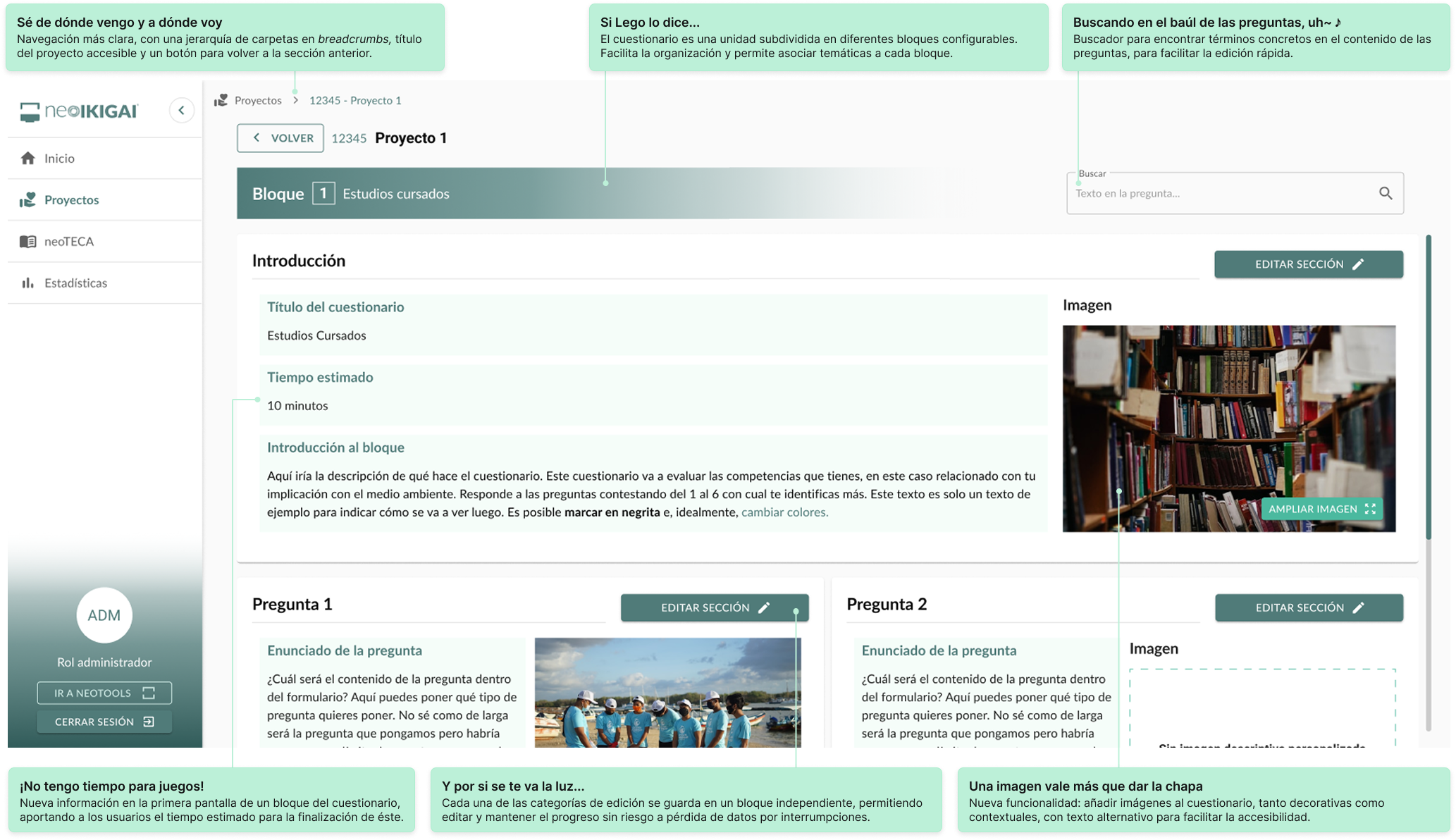 Otro de los proyectos en los que participé como diseñadora principal en neoCK fue neoTOOLS, la plataforma de login único para la gestión de proyectos de neoCK que mencioné antes. Desde su concepción, ya tuve en cuenta para la estructuración de la base de datos y la arquitectura el hecho de que íbamos a tener que integrar herramientas como neoIKIGAI en su base de datos, ya que la antigua organización era demasiado caótica y poco consistente para integrarla directamente. Para que el nuevo neoIKIGAI funcionase era necesario crear una nueva jerarquía de la información, analizando el producto desde cero y planteando una estructura en la que todos los proyectos partiesen de una plantilla de cuestionario sobre la cual realizar modificaciones. Al hacerlo de esta manera reducíamos el tiempo que se tardaba en configurar un nuevo proyecto, generábamos consistencia y facilitábamos el flujo de trabajo.