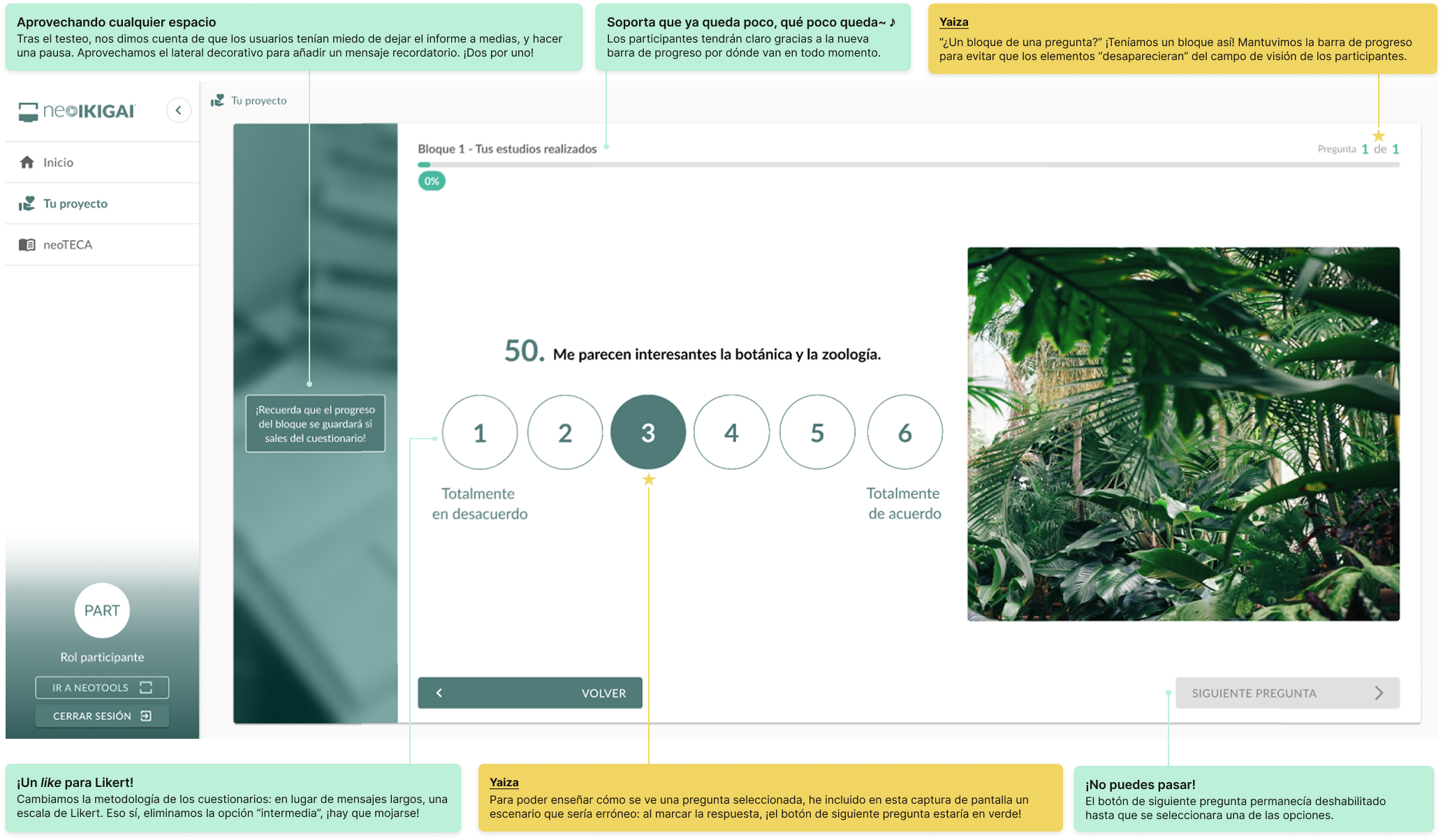 ¿Y el cuestionario en sí? También necesitaba un cambio urgente. El diseño estaba desfasado, apretado al centro y con muchísimo más texto del que daba tiempo a leer en experiencias con límite de tiempo. Se adaptó el nuevo diseño a un formato que permitía adaptarse a móvil de forma más sencilla (botones grandes, paneles flexibles), y se añadieron indicadores visuales más claros del progreso. Además, se modificó el sistema de evaluación, utilizando una escala de Lickert adaptada, que permitía la estandarización de las puntuaciones y una experiencia mucho más rápida para los participantes.
