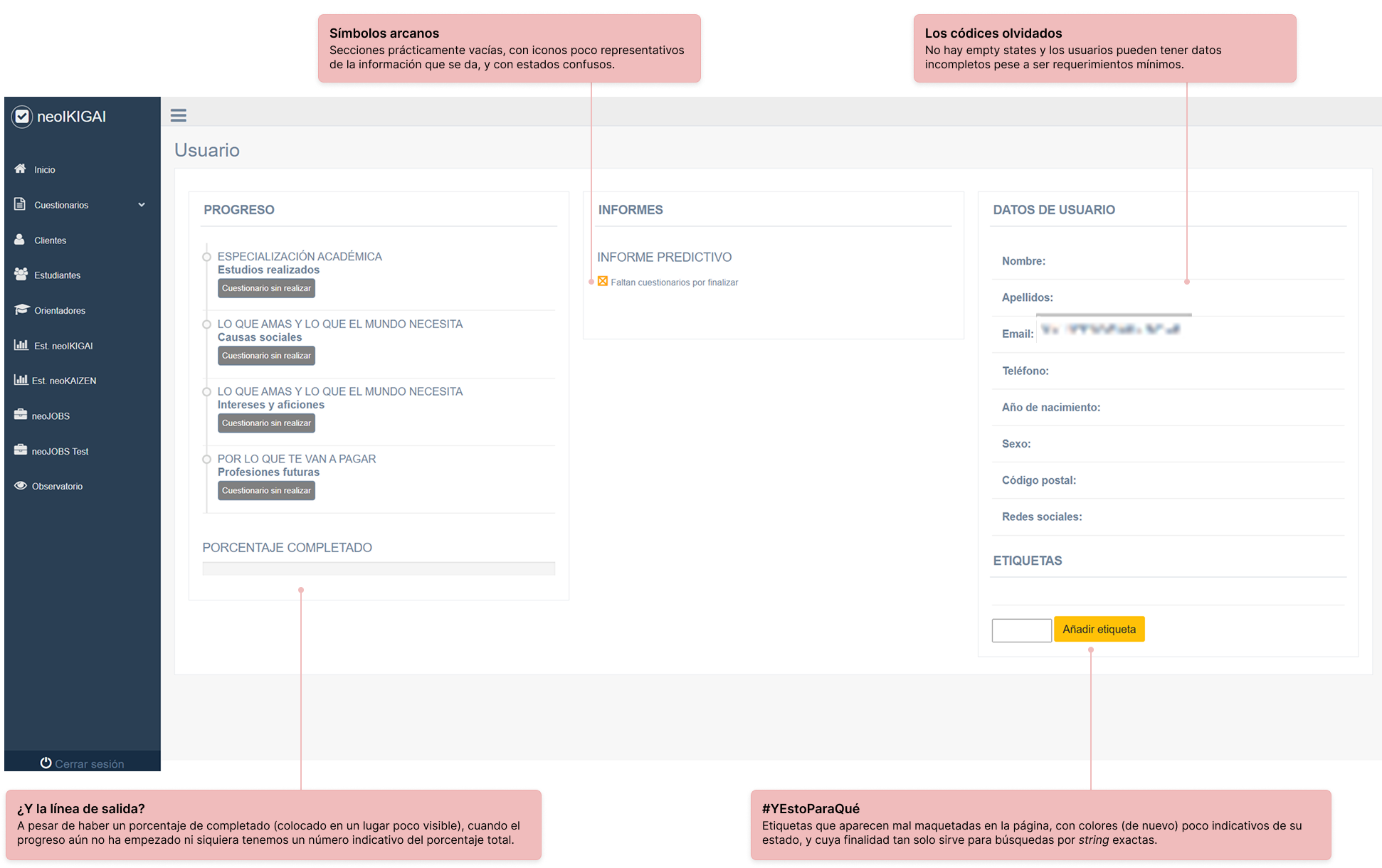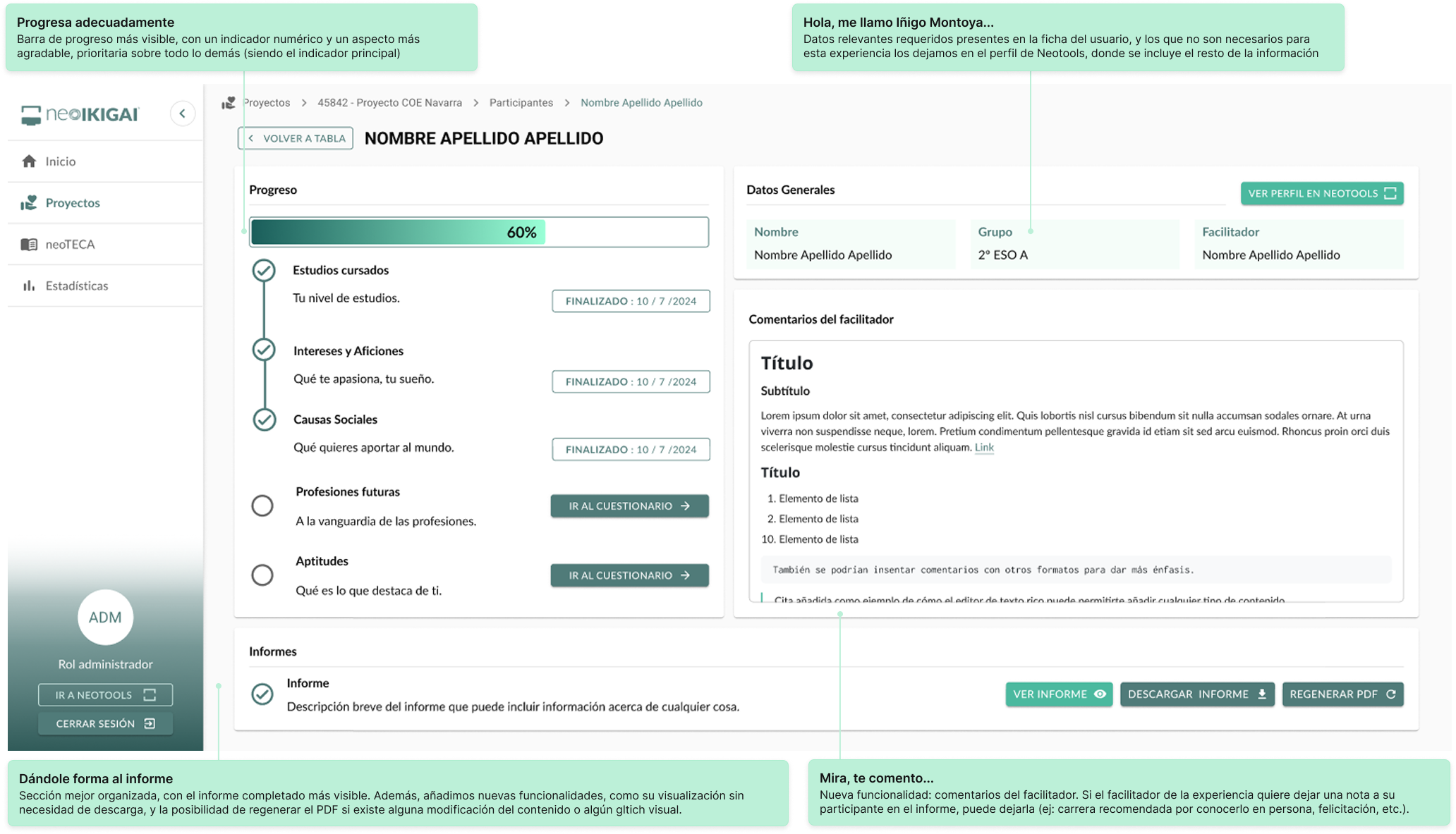 Este proyecto ha sido un reto que ha requerido meses de trabajo, investigación y desarrollo. Desde el principio una de mis principales limitaciones era el poco conocimiento que tenía acerca de los procesos de orientación profesional, particularmente en FP, y el desconocimiento de las funciones y el día a día de los profesionales en el el ámbito de la orientación. Por suerte, gracias al contacto directo de neoCK con tales perfiles, tuve la maravillosa oportunidad de poder conocer y conversar con todo tipo de perfiles en el sector, lo que me permitió descubrir lo importante que era que esta plataforma funcionase lo mejor posible, evaluando todas las oportunidades de mejora que estaban a nuestro alcance.Me alegra haber podido participar en un proyecto de esta envergadura, y sobre todo, con tanto impacto social. Poder ofrecer a los orientadores una herramienta útil para su día a día es fantástico, pero sobre todo creo que poder ayudar a jóvenes a tomar una decisión tan importante, con información veraz y adaptada a ellos, es maravilloso.Definitivamente creo que esta es una herramienta que me habría gustado poder utilizar durante mi formación, y me alegra haber participado en el proceso de rediseño, aportando mi grano de arena para que alguien pueda encontrar su vocación.